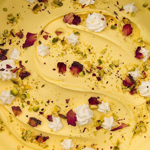 This Persian-inspired gelato is based on bastani sonnati, a beloved traditional ice cream from Iran. Made with milk, eggs, saffron, rose water, and pistachios, it's one of the most iconic desserts in Persian cuisine. We stay true to the original recipe, adding delicate frozen cream pieces and edible rose petals for texture and beauty. Fragrant, floral, and luxurious, it's a truly timeless flavor.